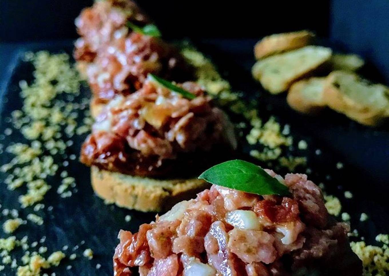 Lo he puesto en tostaditas individuales envuelto en tomate seco en aove.#lastecetasdemama #fuet #tartar
