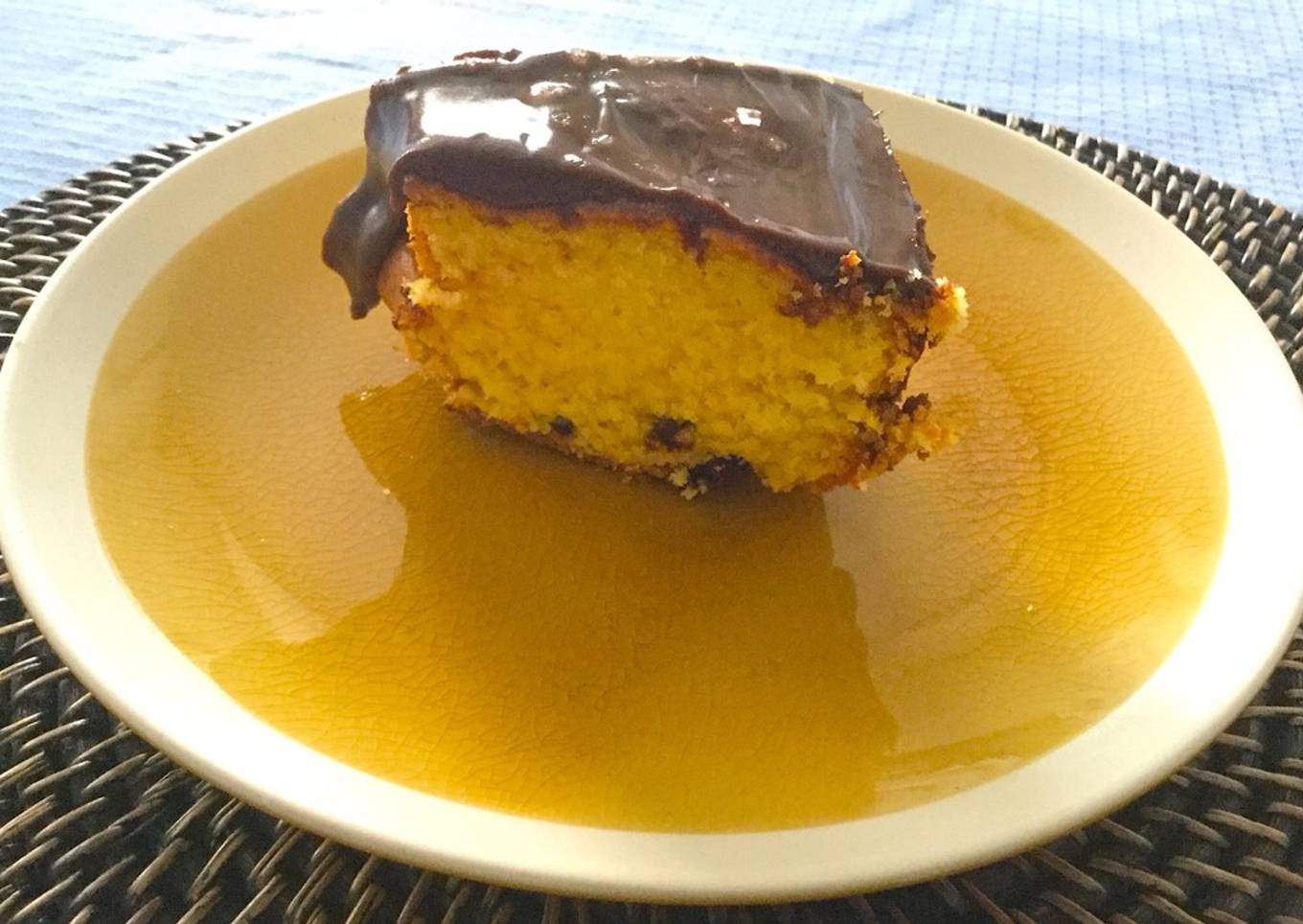 - Introducir en horno caliente a 160º durante unos 40 minutos, dependiendo del molde y del horno. Ya tenemos el bizcocho. Desmoldad y cuando haya enfriado un poco, cubrid con el chocolate.